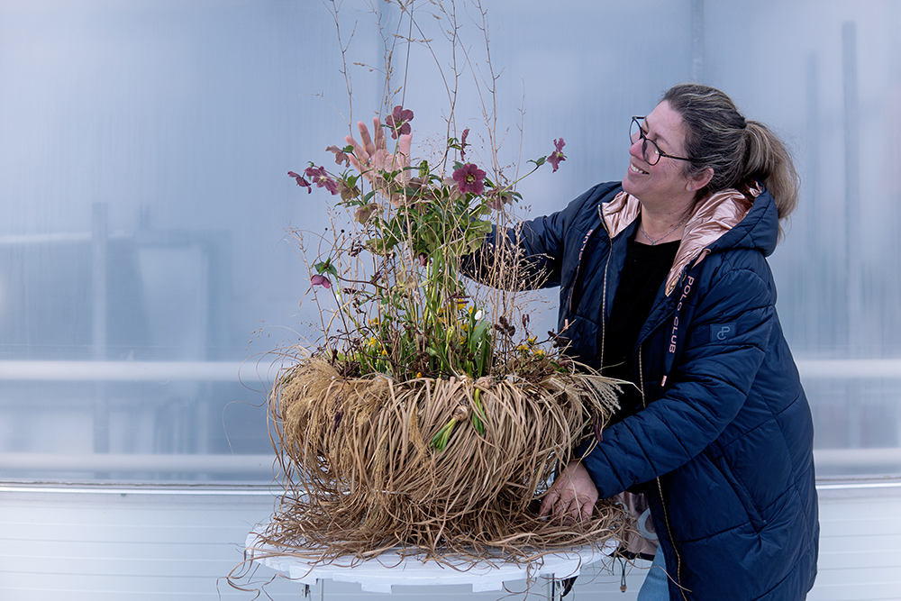 2. das Gefäß „Garten-Echo: Symbiose aus Miscanthus und Frühlingsjuwelen“ – ein selbstgefertigtes Kunstwerk aus Chinaschilf.