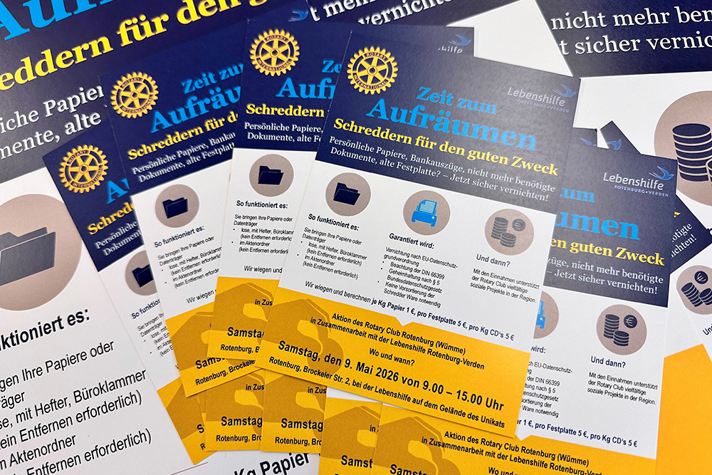 ROTENBURG (April 2026). Sucht Ihr zu Hause schon kräftig alte Dokumente und Akten?! Wir möchten Euch nochmal an die Schredderaktion erinnern – verbunden mit dem Marktplatzfest beim UNiKAT. Denn: Bereits zum sechsten Mal wird die Aktion „Schreddern für den guten Zweck“ vom Rotary Club Rotenburg (Wümme) durchgeführt und die Lebenshilfe Rotenburg-Verden ist mit ihrer Schredderei gerne erneut mit im Boot.