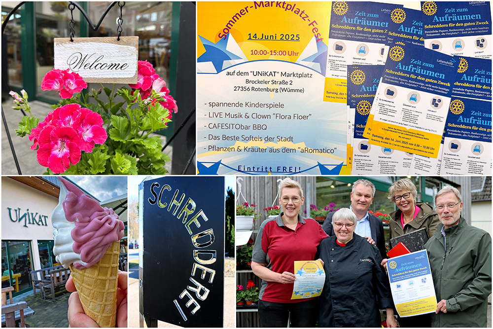 ROTENBURG (Juni 2025). Ihr habt Lust auf leckeres Essen? Auf Softeis? Auf Spiele für Kinder und Live-Musik? Und vielleicht wollt Ihr Euch auch von lästigen alten Dokumenten und Aktenbergen zu Hause befreien und damit noch einen guten Zweck unterstützen? Dann kommt am Samstag, 14. Juni, unbedingt zum UNiKAT in der Brockeler Straße 2-4 in Rotenburg! Dann steigt dort das Marktplatzfest, verbunden mit der Aktion „Schreddern für den guten Zweck“ vom Rotary Club Rotenburg (Wümme).